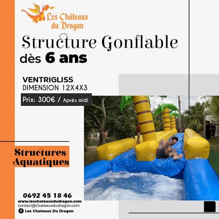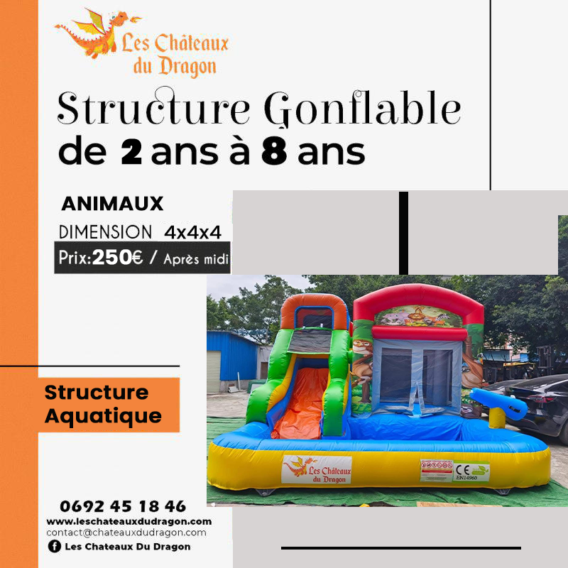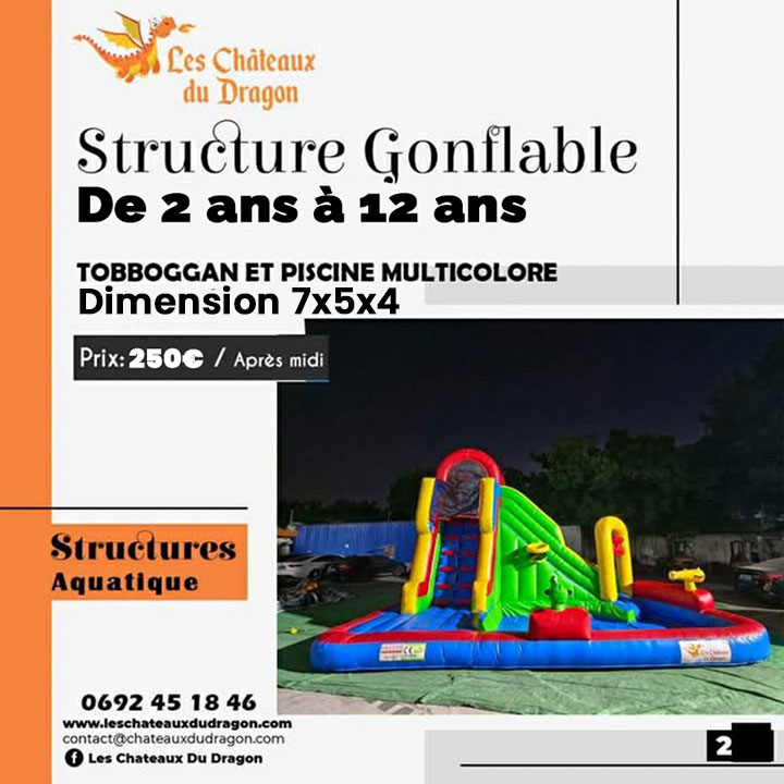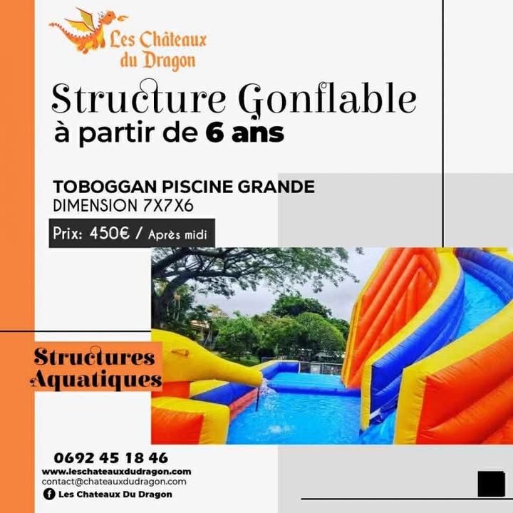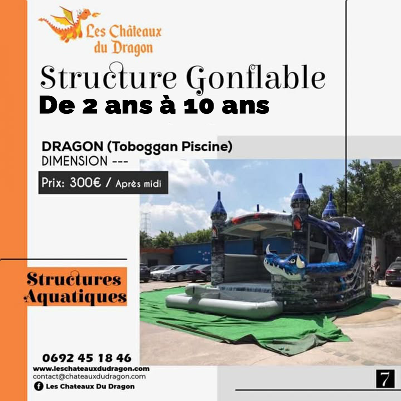 Chaque éclat de rire et chaque plongeon deviennent des moments inoubliables avec notre château gonflable Dragon Toboggan Piscine. Plongez dans l'aventure avec ce chef-d'œuvre ludique qui offre une combinaison parfaite d'excitation et de rafraîchissement. Le toboggan serpentant à travers les écailles du dragon conduit à une piscine pétillante, créant une expérience aquatique immersive. Fabriqué avec des matériaux de qualité et une attention particulière aux détails, ce château gonflable promet des heures d'amusement pour tous les petits aventuriers. Transformez votre événement en une fête magique avec le Dragon Toboggan Piscine, où le divertissement rencontre la fraîcheur de l'eau.