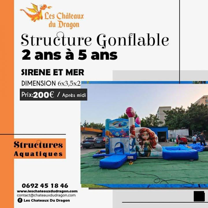Fabriqué avec des matériaux de qualité supérieure, "Sirène et Mer" assure un divertissement sécurisé pour les petits explorateurs marins. Transformez votre événement en une aventure mémorable avec ce château gonflable captivant, où chaque rebondissement est une plongée dans le monde merveilleux des sirènes et de la mer.